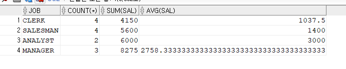 select deptno, count(*), sum(sal), round(avg(sal), 2)