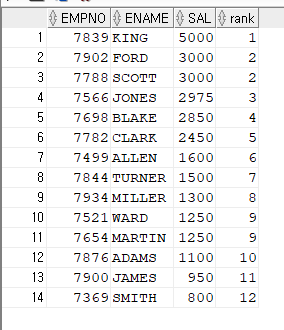 select empno, ename, sal, dense_rank() over(order by sal desc) "rank"