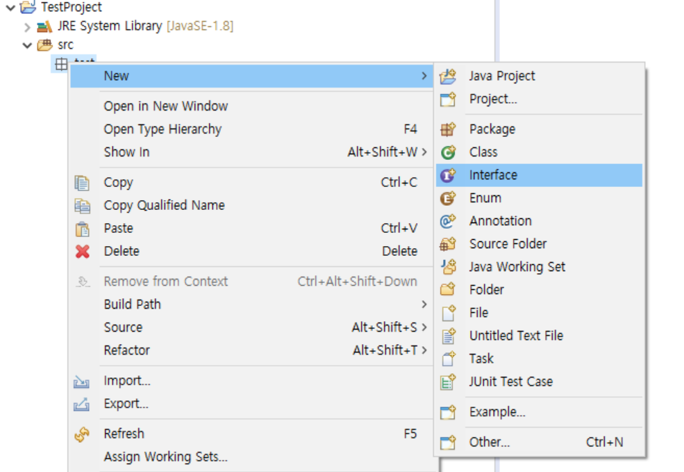 자바에서 인터페이스는 Class가 아닌 Interface를 만들어 사용한다.
