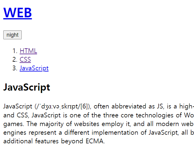 <span id="first" class="js">JavaScript</span> (/ˈdʒɑːvəˌskrɪpt/[6]), often abbreviated as JS, is a high-level, dynamic, weakly typed, prototype-based, multi-paradigm, and interpreted programming language. Alongside <span>HTML</span> and <span>CSS</span>, <span class="js">JavaScript</span> is one of the three core technologies of World Wide Web content production. It is used to make webpages interactive and provide online programs, including video games. The majority of websites employ it, and all modern web browsers support it without the need for plug-ins by means of a built-in <span class="js">JavaScript</span> engine. Each of the many <span class="js">JavaScript</span> engines represent a different implementation of <span class="js">JavaScript</span>, all based on the ECMAScript specification, with some engines not supporting the spec fully, and with many engines supporting additional features beyond ECMA.