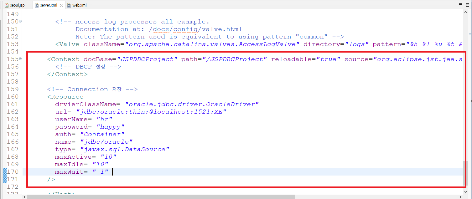 sever.xml의 155번 문단을 다음과 같이 수정한다.