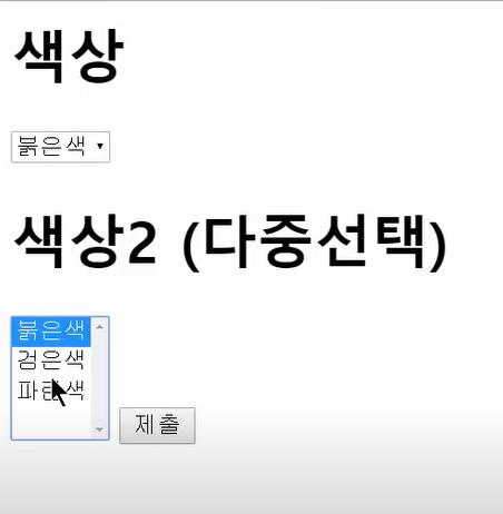 <select name="color2" multiple></select> =태그를 묶는 태그 = multiple로 여러 개의 option을 선택할 수 있도록 한다. |