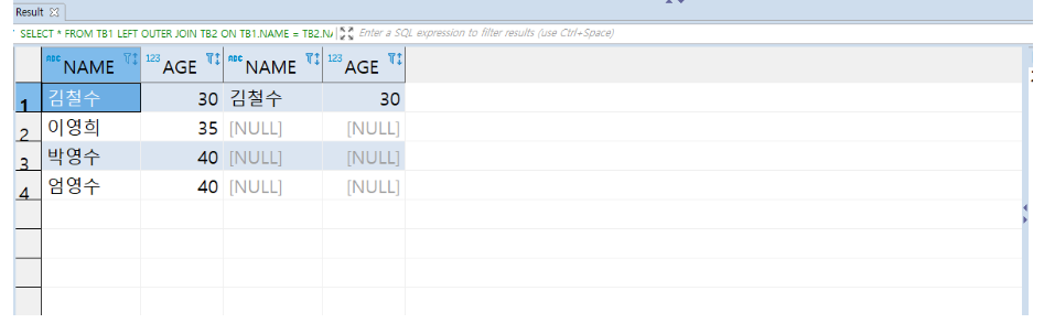 여기 NAME과 AGE 형태의 값을 받는 테이블 TB1, TB2가 있는데