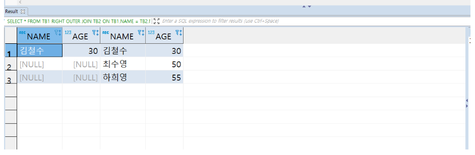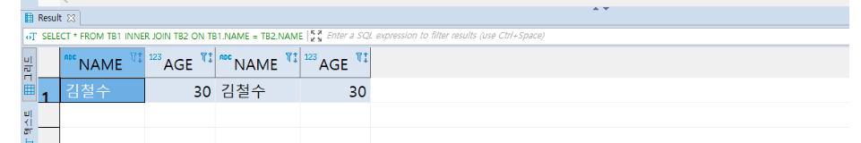 TB1의 NAME과 TB2의 NAME이 같은 경우는 김철수 밖에 없으니 김철수만 나온다.