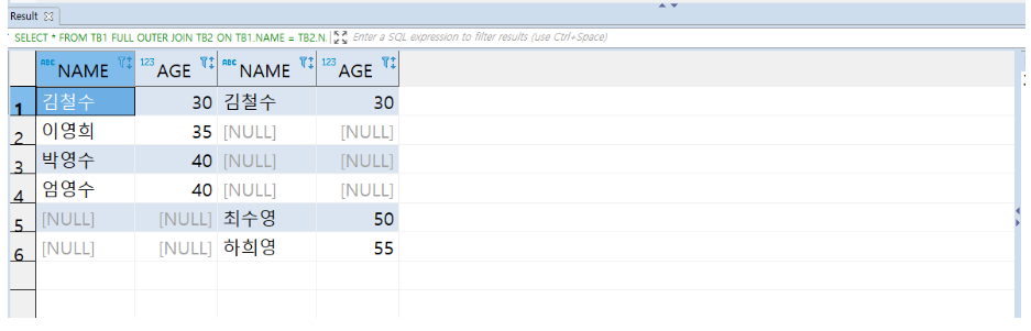 보면 LEFT, RIGHT 테이블 모두 조건에 맞는 값은 김철수 밖에 없으나