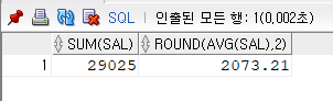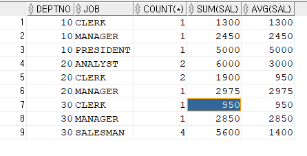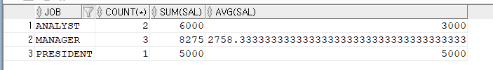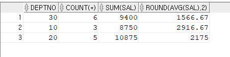 select deptno, count(*), sum(sal), round(avg(sal), 2)