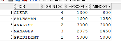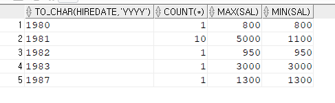 select to_char(hiredate, 'yyyy'), count(*), max(sal), min(sal)