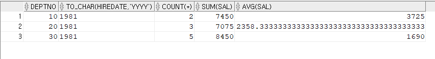 select deptno, to_char(hiredate, 'yyyy'), count(*), sum(sal), avg(sal)