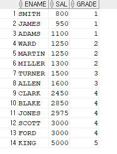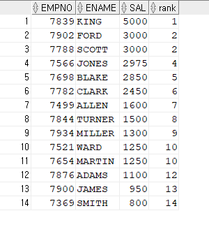 select empno, ename, sal, dense_rank() over(order by sal desc) "rank"