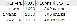 -- 성과금 받는 사원의 이름, 급여, 성과금, 부서명