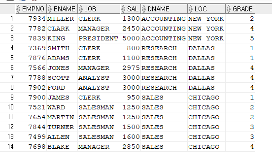 -- 사번, 이름, 직위, 급여(emp, 부서명, 근무지(dept), 급여등급(salgrade)
