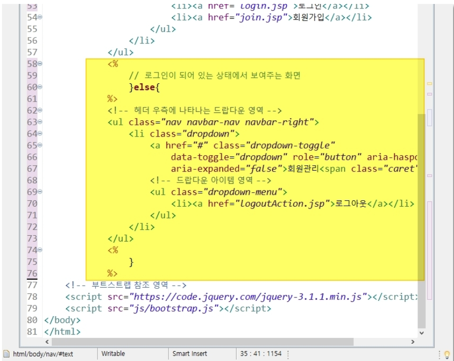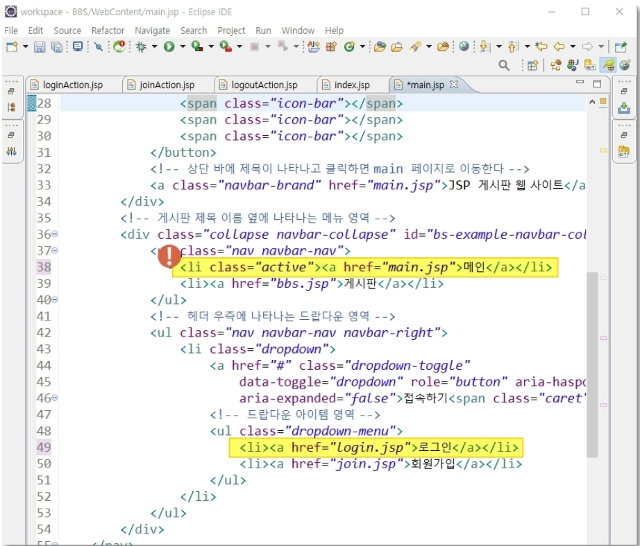 기존에 'active' 영역이 로그인으로 되어 있는데 메인 페이지이니 '메인'이 활성화 될 수 있게 'active' 영역을 옮긴다.