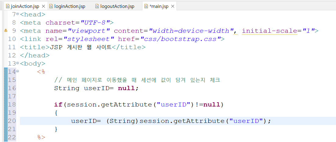 'loginAction.jsp' 페이지와 마찬가지로 회원가입에 성공했을 때 세션을 부여하는 코드를 추가한다.