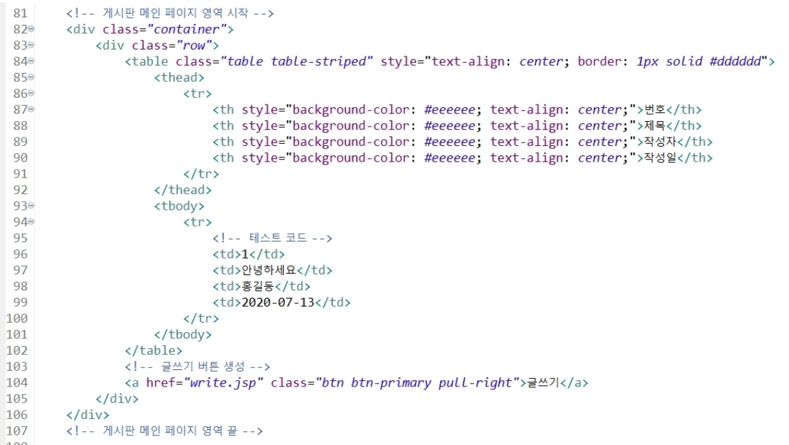 네비게이션 아래 부분에 게시판 메인 페이지 코드를 추가한다.