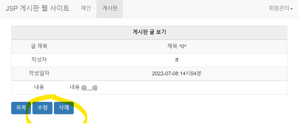 로그인 한 상태에서 게시글을 쓴 ID와 동일하면 수정 및 삭제 버튼이 보인다.