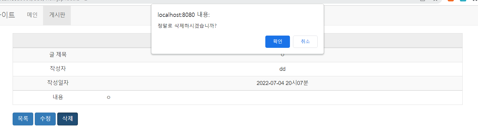 삭제 버튼 클릭 시 알림 창 출력 됨