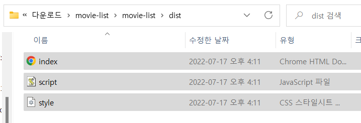 다운 받은 zip 파일의 dist 폴더에 있는 index.html, script.js, style.css 파일들을 복사해 music 폴더에 첨부한다.